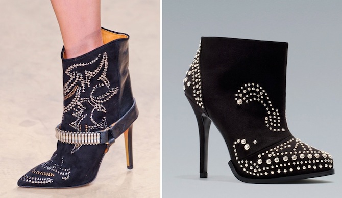 La de la izquierda pertenece al desfile de Isabel Marant, últimamente más conocida para los mortales por sus famosísimas sneakers ( a las que ya dedicamos un post) y las de la derecha casí idénticas, clonaditas de ZARA.